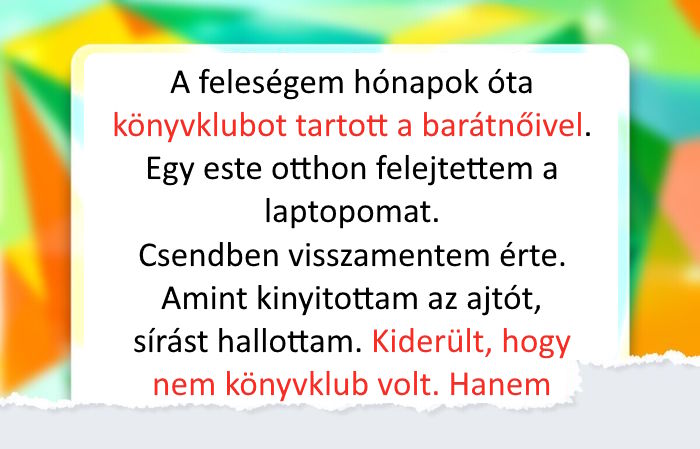 • A feleségem hónapok óta könyvklubot tart a barátnőinek. Ilyenkor elmegyek néhány órára, hogy magukra hagyjam őket. Egyik este otthon felejtettem a laptopomat, csendben visszamentem érte. Mikor kinyitottam az ajtót, észrevettem valami furcsát. A nappali tökéletesen tiszta volt. Nem voltak könyvek, tányérok, csak pár üres pohár a pulton. A folyosóról sírást hallottam. A hálószobánkból jött. A feleségem és a barátnői ott ültek körben a földön. Riadtan néztek rám, és én is meglepődtem.