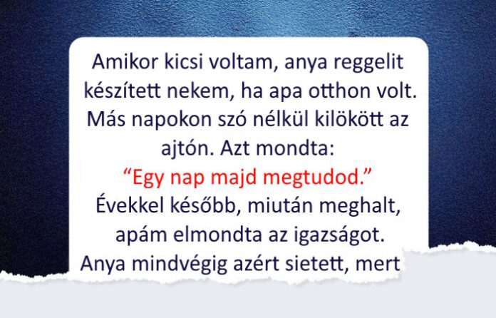 - Kiskoromban anyukám mindig korán készített nekem reggelit, de csak azokon a reggeleken, amikor apukám otthon maradt. Soha nem értettem, miért sietett ki az ajtón szó nélkül a többi napon. Csak mosolygott és azt mondta: “Ha nagyobb leszel, majd megérted.”