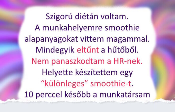 - Szigorú diétán voltam. A munkahelyemre smoothie alapanyagokat vittem magammal. Speciális protein, mandula, tej, gyümölcs. Mindegyik eltűnt a hűtőből. Mikor harmadjára fordult ez elő, elegem lett, elhatároztam, hogy véget vetek ennek. Nem panaszkodtam a HR-nek és nem ragasztottam ki dühös cetliket. Helyette készítettem egy “különleges” smoothie-t, amiben a proteint ehető csillámporral helyettesítettem. Tökéletesen elkeveredett benne. Másnap reggel már 10-kor félig üres volt az üveg. 10 perccel később bejött az egyik munkatársam, az egész szája csillogott a csillámportól. Többé semmihez nem nyúlt a hűtőben.