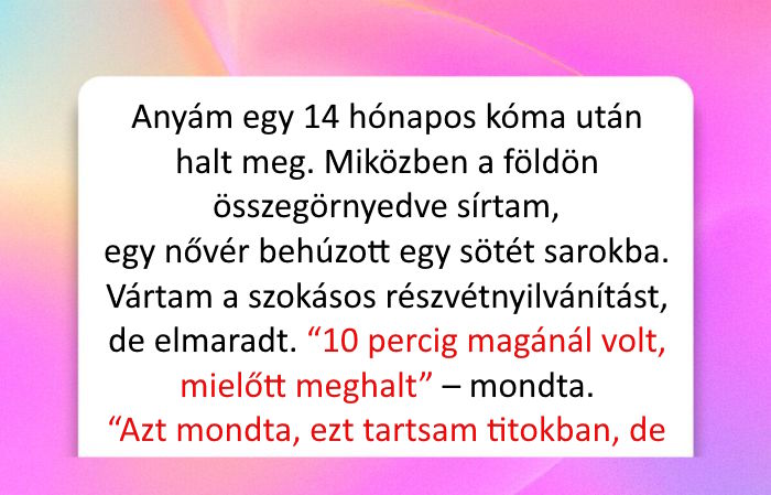 - Anyám egy 14 hónapos kóma után halt meg. Miközben a földön összegörnyedve sírtam, egy nővér behúzott egy sötét sarokba. Vártam a szokásos részvétnyilvánítást, de elmaradt. “10 percig magánál volt, mielőtt meghalt” – mondta. “Azt mondta, ezt tartsam titokban, de azt mesélte, hallott minden egyes szót, amit mondtatok neki az elmúlt hónapok alatt. Nem esett csapdába, csak hallgatta a hangotokat.” A nővér megszorította a kezemet, és azt mondta: “Tudom, hogy egész életedben azon rágódtál volna, hogy vajon hallott-e titeket. Hallott, nem a falnak beszéltetek.”