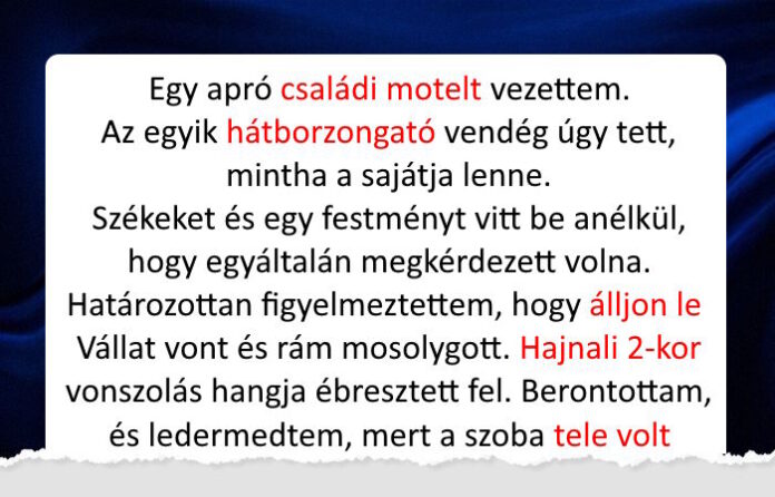 Nem nagyon törődtem vele, hiszen csak pár napig maradt és azon a héten szinte üres volt a motel. Aztán éjjel 2-kor arra ébredtem, hogy húzogatja a bútorokat. Ekkor bementem a szobájába, és ledöbbentem.
