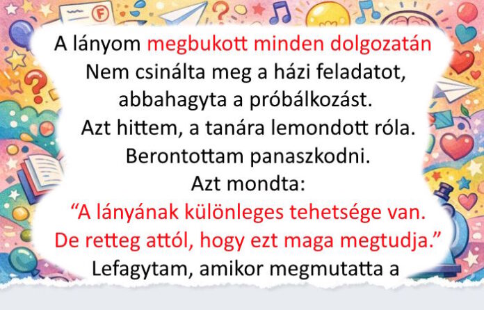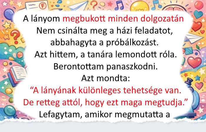 Mrs. Peterson elővett egy mappát, és azt mondta: “A lányának különleges tehetsége van. De retteg attól, hogy ezt maga megtudja.” A mappában fogalmazások és versek voltak, amiket Emma írt. Érett és gyönyörű írások.
