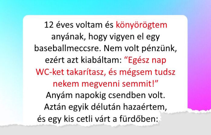 • 12 éves voltam és könyörögtem anyának, hogy vigyen el egy baseballmeccsre. Nem volt pénzünk, ezért azt kiabáltam: “Egész nap WC-ket takarítasz, és mégsem tudsz nekem megvenni semmit!” Anyám napokig csendben volt. Aztán egyik délután hazaértem, és egy kis cetli várt a fürdőben: “Jegyek a baseball meccsre.” Kiderült, hogy jegyeket és játékpénzt készített arra a meccsre, amit meg akartam nézni. Ott állt az ajtóban mosolyogva. Székeket tett a tévé elé, mintha stadionülések lennének, még hotdogot és üdítőt is hozott. Az egész meccset együtt néztük. Talán sok ember számára ez nem nagy dolog, de nekem az egyik legszebb gyermekkori emlékem. Köszönöm az én elhunyt anyukámnak.