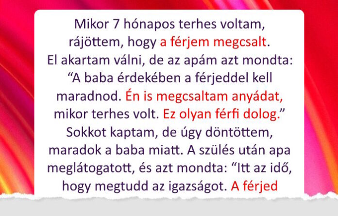 Teljesen sokkot kaptam, el sem tudtam volna képzelni ilyet apámról. De miután átgondoltam, úgy döntöttem, maradok. Nem azért, mert megbocsátottam a férjemnek, hanem mert a babára akartam koncentrálni. Úgy voltam vele, meglátjuk, mi történik később. Néhány hónappal később egészséges fiam született. Apám bejött a kórházba, megfogta a kezemet, és azt mondta: “Itt az idő, hogy megtudd az igazságot. A te férjed számomra a legundorítóbb ember a világon. Azt akarom, hogy most rögtön válj el tőle. Mi majd segítünk neked a babával.”