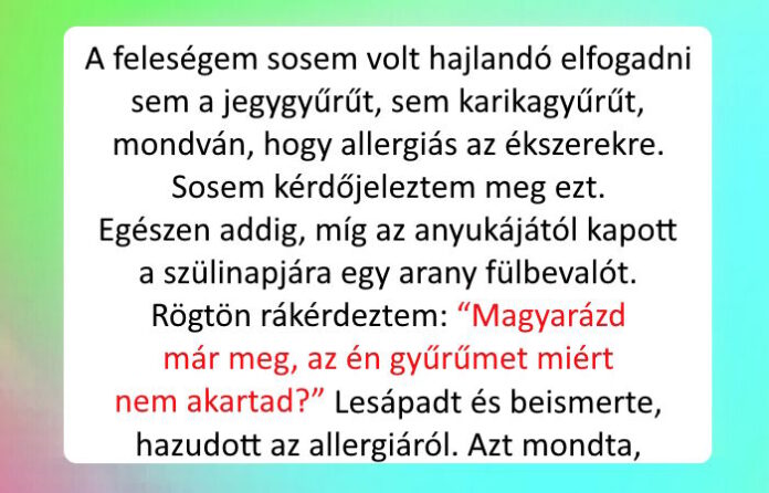 - A feleségem sosem volt hajlandó elfogadni sem a jegygyűrűt, sem karikagyűrűt, mondván, hogy allergiás az ékszerekre. Sosem kérdőjeleztem meg ezt. Egészen addig, míg az anyukájától kapott a szülinapjára egy arany fülbevalót. Rögtön rákérdeztem: “Magyarázd már meg, az én gyűrűmet miért nem akartad?” Lesápadt és beismerte, hazudott az allergiáról. Azt mondta, nem akart drága gyűrűket, mert tudta, milyen keményen dolgozom. Nem akarta, hogy túl sokat költsek rá, és szerinte a szerelem és az esküvő nem a gyűrűkön múlik. Azok csak szimbólumok, nem pedig a kapcsolat lényegei. © Sam A.