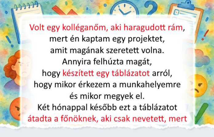 • Volt egy kolléganőm, aki haragudott rám, mert én kaptam egy projektet, amit magának szeretett volna. Annyira felhúzta magát, hogy készített egy táblázatot arról, hogy mikor érkezem a munkahelyemre és mikor megyek el. Két hónappal később ezt a táblázatot átadta a főnöknek, aki csak nevetett, mert mi megegyeztünk, hogy akkor jövök és megyek, amikor én akarok, amíg bizonyos számú munkaórám megvan a héten. © Beachy5313 / Reddit