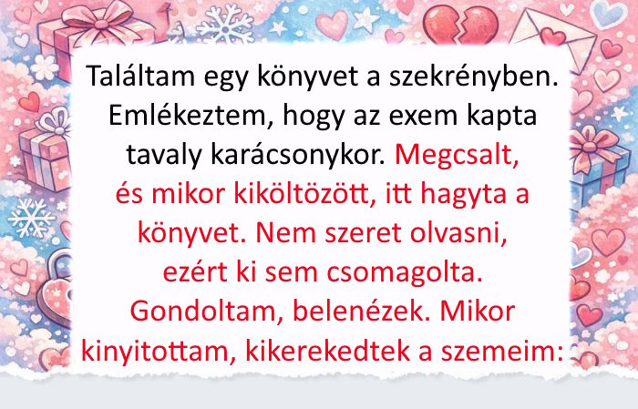 • Találtam egy könyvet a szekrényben. Emlékeztem, hogy az exem kapta tavaly karácsonykor a nagynénjétől. Az exem megcsalt, és mikor kiköltözött, itt hagyta a könyvet. Nem szeret olvasni, ezért ki sem csomagolta.