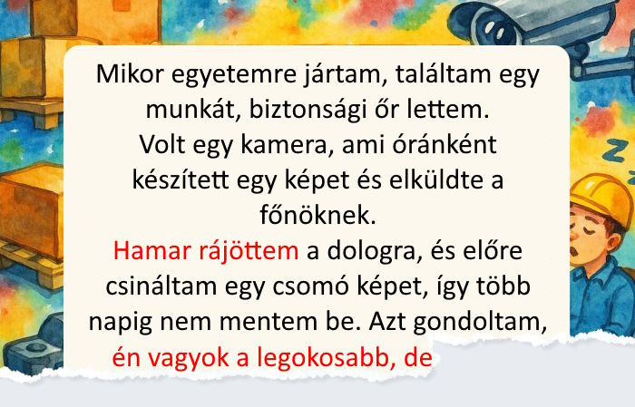 - Mikor egyetemre jártam, találtam egy éjszakai munkát. Biztonsági őr lettem egy kis raktárban. Rajtam kívül senki sem volt ott, de volt a fülkében egy kamera, ami óránként készített egy képet és elküldte a főnöknek. Hamar rájöttem a dologra, és előre csináltam egy csomó képet különböző pózokban, különböző ruhákban, még az asztalt is átrendeztem, így több napig nem kellett bemennem a munkahelyemre. Akkoriban azt gondoltam, én vagyok a világon a legleleményesebb és legokosabb ember, de tévedtem. Fizetésnapon egy képet küldtek nekem a pénzről… © Not everyone will understand / VK