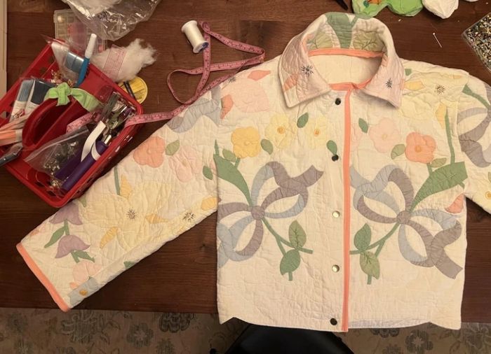 9. “Ezen a héten sokat fejlesztettem a varrótudományomon azzal, hogy turkálós steppelt ruhákból készítettem steppelt darabokat. Ezt a kabátkát tegnap este készítettem az egyik barátomnak.”