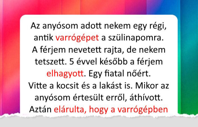 Mikor az anyósom értesült erről, áthívott magához. Aztán bizalmasan elárulta, hogy gyémántok vannak a varrógépben. A nagyanyja hagyta benne őket. Bocsánatot kért a fia miatt, és mondta, hogy lakjak nála.