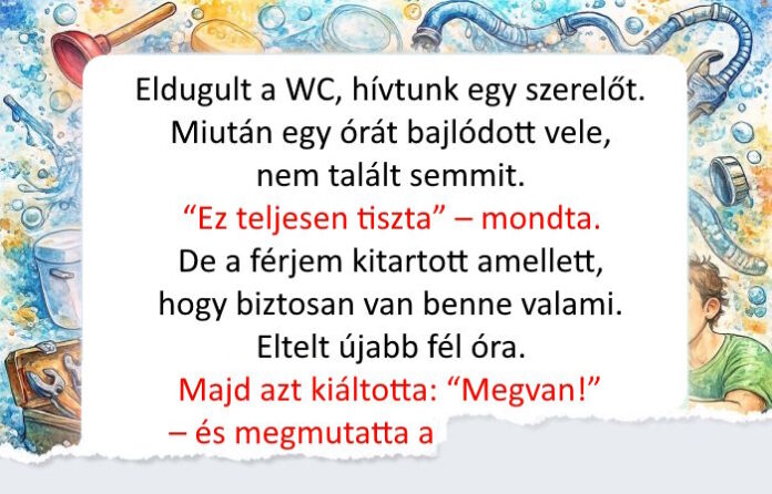 Ő csak vigyorgott, és azt mondta: “Ön egy nő. Miért nem ügyel jobban a személyes tárgyaira?” És átnyújtott egy aranyláncot, amit réges-rég elvesztettem. Kiderült, hogy szerelés közben találta meg. Nevetni kezdett, és mondta, hogy csak viccelt. Értékes leletre bukkant! - Eldugult a WC, hívtunk egy szerelőt. Miután egy órát bajlódott vele, nem talált semmit. “Ez teljesen tiszta” – mondta. De a férjem kitartott amellett, hogy biztosan van benne valami. Eltelt újabb fél óra. Majd azt kiáltotta: “Megvan!” – és megmutatta a teáskanna fedelét. Kiderült, hogy mikor a maradék teát a WC-be öntöttem, nem vettem észre, hogy beleesett a kanna fedele. Én elvörösödtem, a férjem viszont elégedett volt magával.
