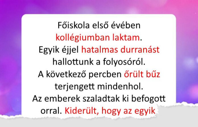- Főiskola első évében kollégiumban laktam. Egyik éjjel hatalmas durranást hallottunk a folyosóról. Mintha valaki felfújt volna egy nagy papírtáskát és kidurrantotta volna. A következő percben őrült bűz jött be hozzánk.
