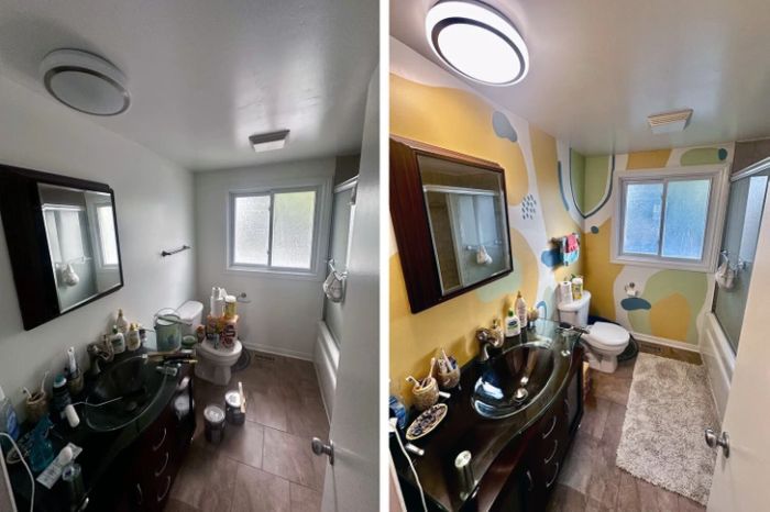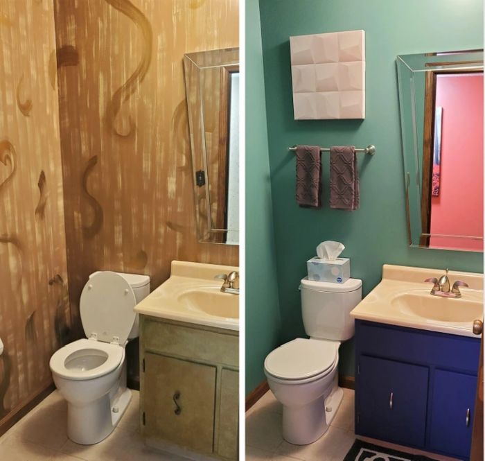 12. “A fürdőszoba korábban és most az új otthonomban. Az előző tulajnak elég sajátos ízlése volt.”