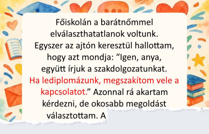• Főiskolán a barátnőmmel elválaszthatatlanok voltunk. Egyszer az ajtón keresztül hallottam, hogy azt mondja: “Igen, anya, együtt írjuk a szakdolgozatunkat. Ha lediplomázunk, megszakítom vele a kapcsolatot.” Azonnal rá akartam kérdezni, de okosabb megoldást választottam. A szakdolgozat leadása után gratuláltam neki a diploma megszerzéséhez, és hozzátettem: “Majd később ne felejts el letiltani, hiszen többé már nem fogunk beszélni.” Számtalanszor bocsánatot kért, üzeneteket írt, hívott, de a barátságunkat már nem lehetett helyrehozni. Nehéz időszak volt számomra, de azóta jobban értem az embereket. Lett egy másik közeli barátom, akit észre sem vettem, míg ezzel a színlelő nőszeméllyel voltam elfoglalva.