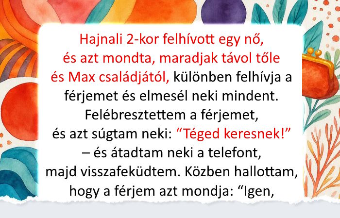 - Hajnali 2-kor felhívott egy nő, és azt mondta, maradjak távol tőle és Max családjától, különben felhívja a férjemet és elmesél neki mindent. Felébresztettem a férjemet, és azt súgtam neki: “Téged keresnek!” – és átadtam neki a telefont, majd visszafeküdtem. Közben hallottam, hogy a férjem azt mondja: “Igen, persze, beszélni fogok vele reggel.”