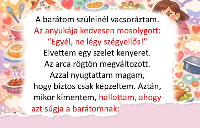 Szerencsére jó humorérzéke volt, nevetett és tovább folytattuk a társalgást. De azért a kínos érzés megmaradt… © KpolllkaPy / Pikabu - A barátom szüleinél vacsoráztam. Az anyukája kedvesen mosolygott: “Egyél, ne légy szégyellős!” Elvettem egy szelet kenyeret. Az arca rögtön megváltozott. Azzal nyugtattam magam, hogy biztos csak képzeltem.