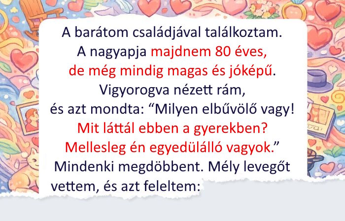 - A barátom családjával találkoztam. A nagyapja majdnem 80 éves, de még mindig magas és jóképű. Vigyorogva nézett rám, és azt mondta: “Milyen elbűvölő vagy! Mit láttál ebben a gyerekben? Mellesleg én egyedülálló vagyok.” Mindenki megdöbbent. Mély levegőt vettem, és azt feleltem: “Csak magára nézek, és látom, hogy jól választottam. Nagyon jó géneket örökölt. Hiba lett volna elszalasztani!” Megfogtam a barátom kezét, kicsit aggódtam, hogyan fognak reagálni. De mindenki jót nevetett. Átmentem a teszten.