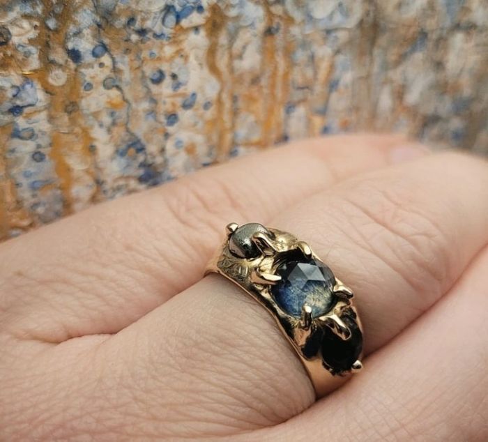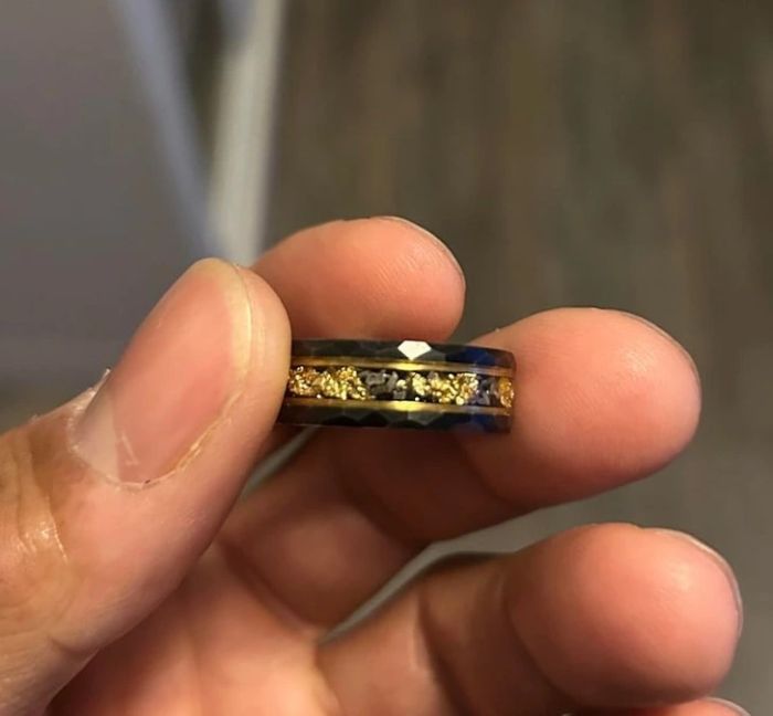 2. “A férjemmel karikagyűrűt készítettünk egymásnak. Én egy sima ezüstöt neki, ő pedig ezt nekem. Van benne egy meteorit, dinoszaurusz fosszília és zafír.”