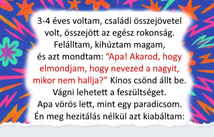 - 3-4 éves voltam, családi összejövetel volt, összejött az egész rokonság. Felálltam, kihúztam magam, és azt mondtam: “Apa! Akarod, hogy elmondjam, hogy nevezed a nagyit, mikor nem hallja?” Kínos csönd állt be. Vágni lehetett a feszültséget. Apa vörös lett, mint egy paradicsom. Én meg hezitálás nélkül azt kiabáltam: “Anyós!” Mindenki dőlt a nevetéstől. © justkhaan5 / Pikabu