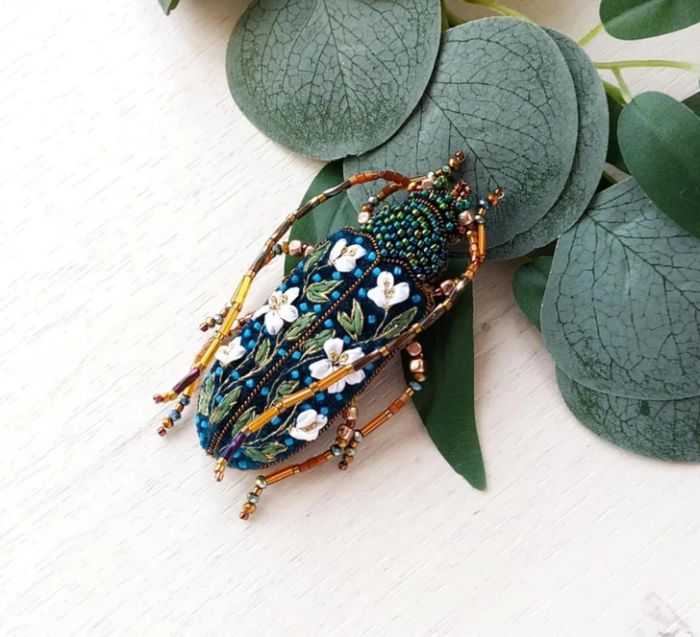 11. “Ezt a brosst bársonyból, selyem szalagokból, gyöngyökből és üveggyöngyökből készítettem.”