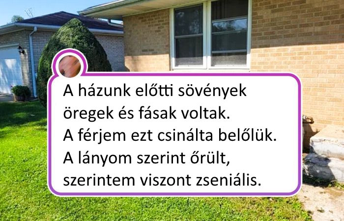 1. “A házunk előtti sövények öregek és fásak voltak. A férjem ezt csinálta belőlük. A lányom szerint őrült, szerintem viszont zseniális.”