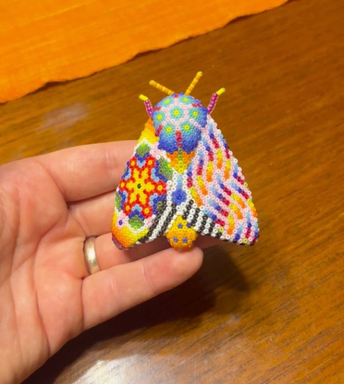13. “Ajándék lesz a keresztlányomnak. A formát fából faragtam ki, viasszal kezeltem és gyöngyökkel díszítettem. A lábai és a csápjai gitárhúrból vannak.”