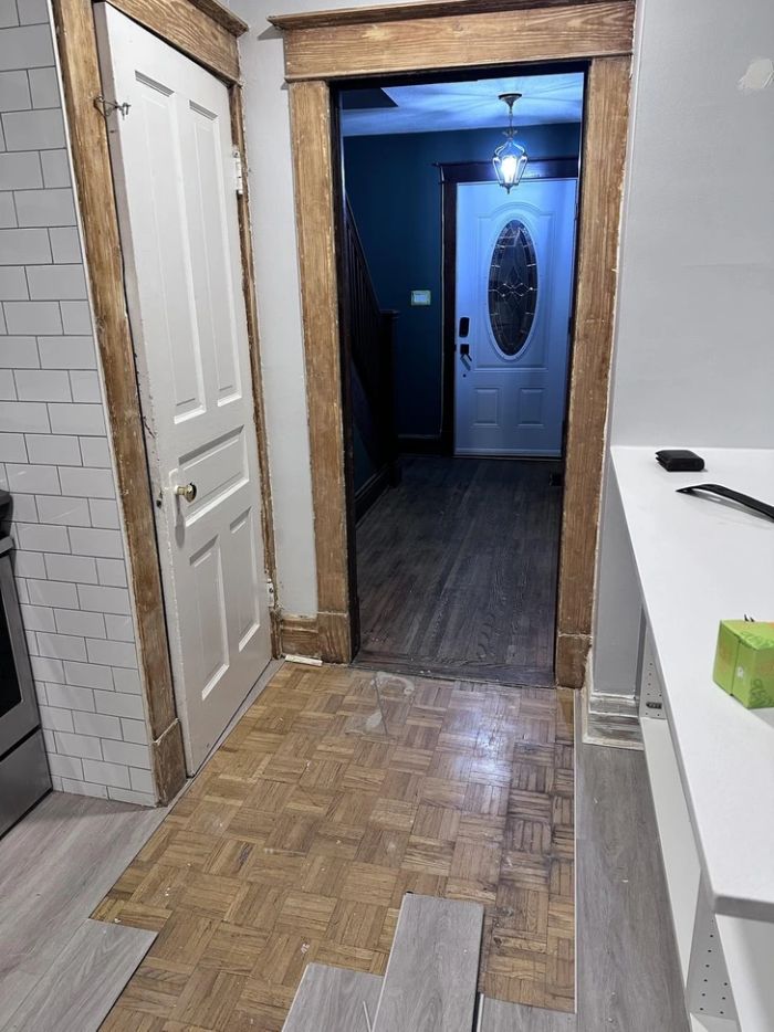 4. “Nemrég vettünk egy 100 éves házat. Miután eltávolítottam két réteg szörnyű laminált padlót, különböző padlóburkolatokat találtam alatta. Íme, mi várt ránk a konyhában!”