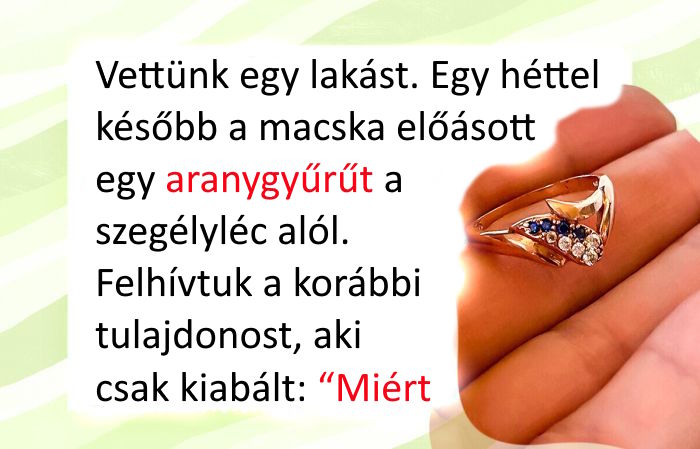 17. “Vettünk egy lakást. Egy héttel később a macska előásott egy aranygyűrűt a szegélyléc alól. Felhívtuk a korábbi tulajdonost, aki csak kiabált: ‘Miért hívnak engem?! Soha nem is hordtam gyűrűt!’ – és letette a telefont. Kissé megdöbbentett a reakciója. Arra a következtetésre jutottunk, hogy talán a férje megcsalta, ezért reagál ilyen érzékenyen erre a felfedezésre.”