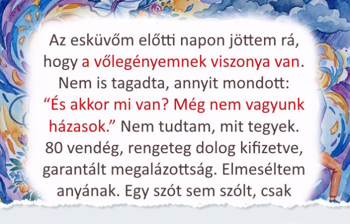 - Az esküvőm előtti napon jöttem rá, hogy a vőlegényemnek viszonya van. Nem is tagadta, annyit mondott: “És akkor mi van? Még nem vagyunk házasok.” Nem tudtam, mit tegyek. 80 vendég, rengeteg dolog kifizetve, garantált megalázottság.