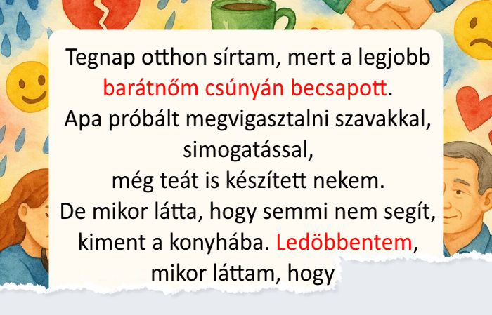 - Tegnap otthon sírtam, mert a legjobb barátnőm csúnyán becsapott. Apa próbált megvigasztalni szavakkal, simogatással, még teát is készített nekem. De mikor látta, hogy semmi nem segít, kiment a konyhába. Ledöbbentem, mikor láttam, hogy tányéron szolgálja fel nekem az utolsó hamburgert. Ő imádja a hamburgert. Bármin hajlandó osztozni, de ezen nem. Úgy tűnik, a lánya vigasztalása még ennél is fontosabb volt neki. © Shkogwarts / VK