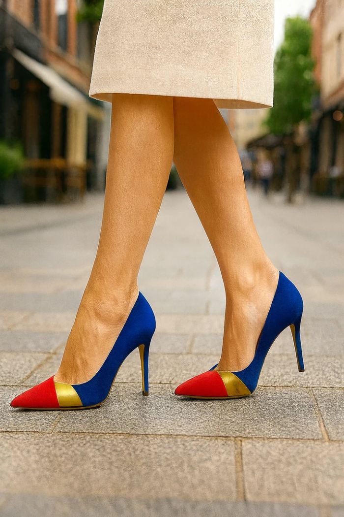 9. Piros, kék és arany colorblock magassarkú