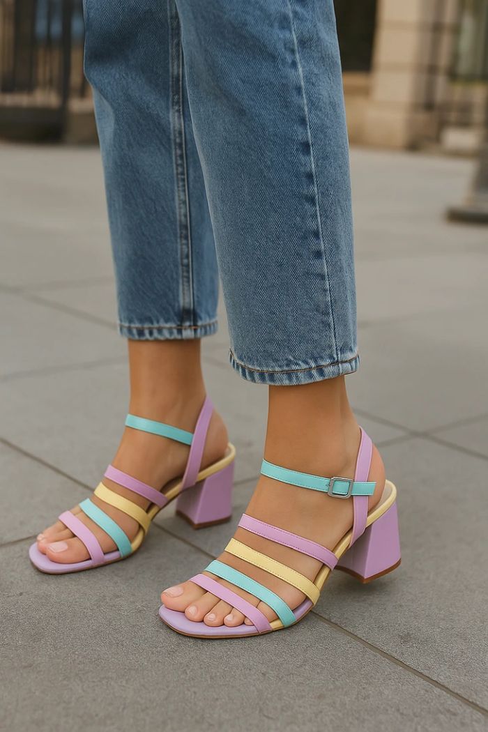 A többszínű szandál játékos hatást kelt, de ha egyszerű farmerhez veszed fel, az öltözéked elveszti kifinomultságát. A rózsaszín, a sárga és a türkiz keveréke túl sok egy egyszerű kék farmerhez.