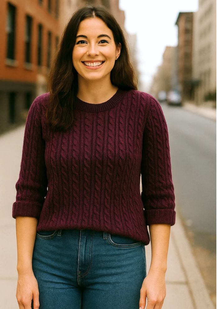 A képen látható, mély szilva színű pulóver csinos, de a háromnegyedes ujj a vastag kötéssel kissé torzítja az arányokat. A nem megfelelő fazonú vagy hosszúságú pulóverek ronthatnak a megjelenéseden, még akkor is, ha a színük remekül áll.