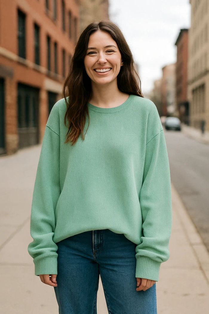 Egy túlméretes darab is lehet csinos, de csak ha kellően stílusos. Máskülönben könnyen formátlanná tehet és olcsó hatást kelthet. A képen a bő, mentazöld pulóver elrejti az alakot, eltünteti a derekat és túlzottan hétköznapivá teszi a külsőt.