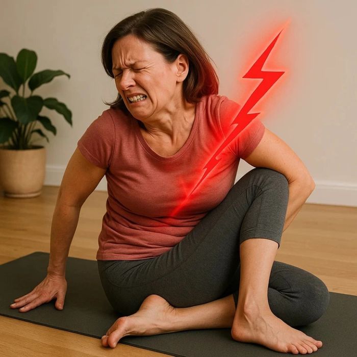 • A képen látható, ülve történő gerinccsavarás segítségével a hát odalán elhelyezkedő izmokat nyújthatod és enyhítheted a még megmaradt feszültséget. Ügyelj arra, hogy a testtartásod egyenes legyen és ne hajolj befelé.